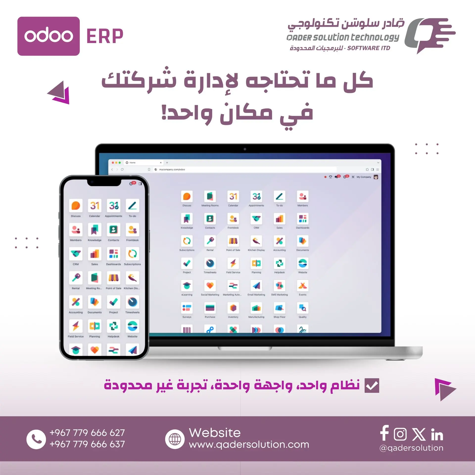 من المبيعات إلى المحاسبة والمخزون والمشروعات — كل شيء في نظام Odoo الذكي.